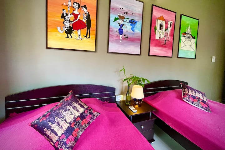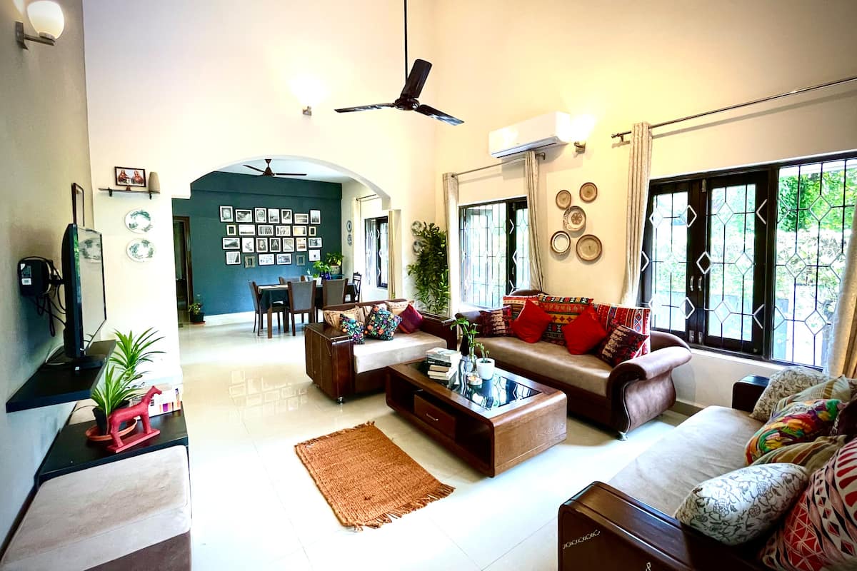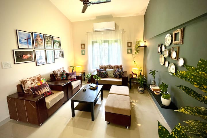 Casa Greens is nestled in Assagao, right opposite Gunpowder restaurant. Pet-friendly, our art inspired luxurious villa is peaceful and one of the greenest properties of North Goa, with 3 acres of semi wild garden behind the villa, along with a vastu swimming pool. A mix of proximity and isolation, we are just 10 mins drive from Anjuna and Vagator, the other ‘happening’ locales of our area. In the lap of nature and tranquility, this villa is all about comfort, luxury and peace.